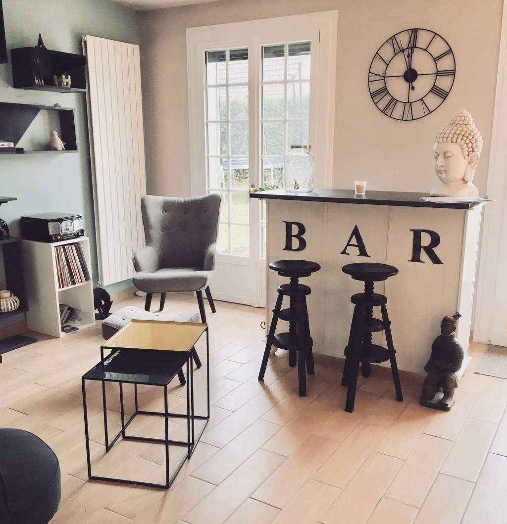 - Et le coin cheminée devient un espace Lounge apéro et lecture avec la création d’une bibliothèque sur mesure, l’installation de fauteuils cosy pour profiter du feu et le relooking du bar 😉 . Cet espace n’est plus du tout laissé à l’abandon par cette famille bien au contraire 🙂 !