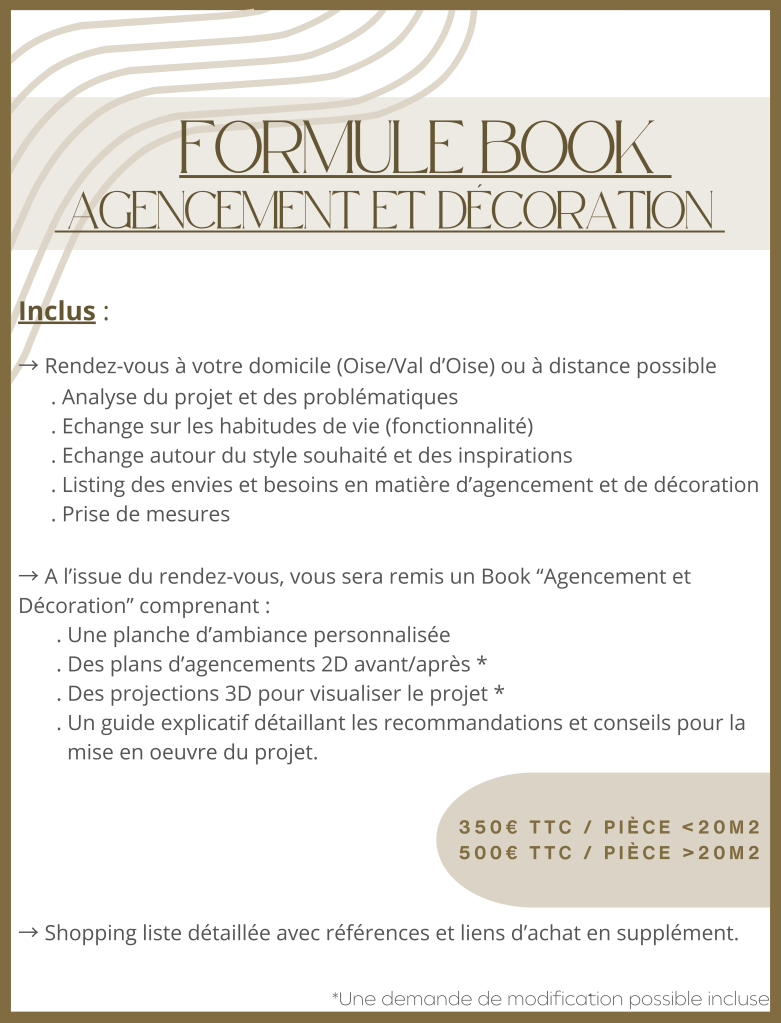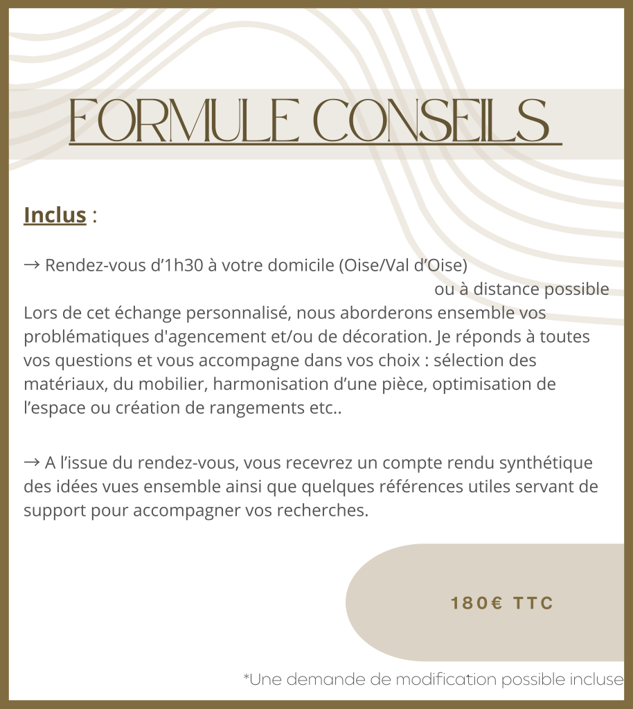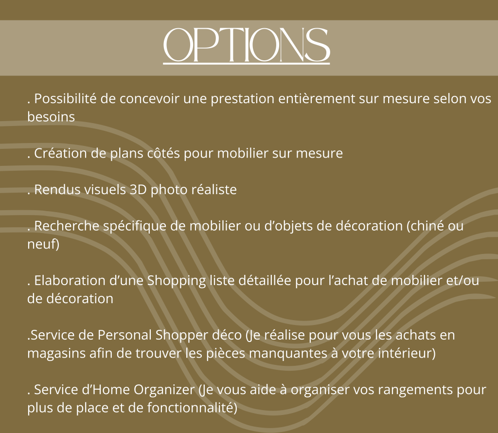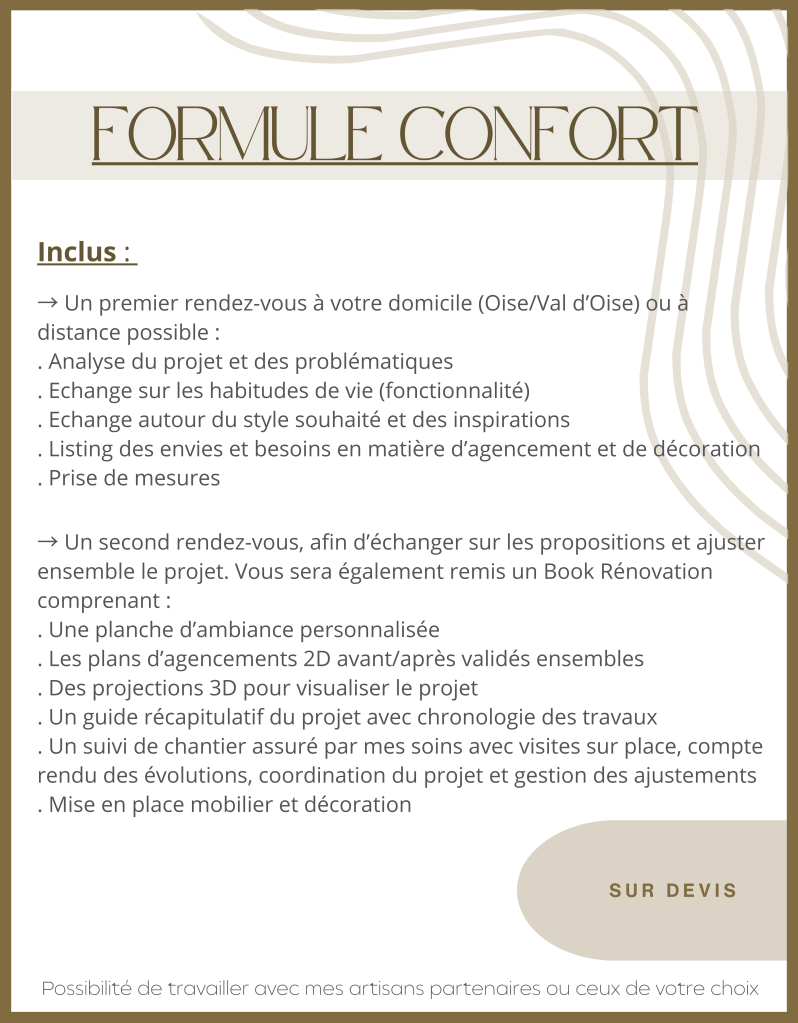 Sur la base de 3 formules adaptables à la demande et avec options à la carte, je vous accompagne dans votre projet de rénovation afin de créer ensemble un intérieur qui vous ressemble.